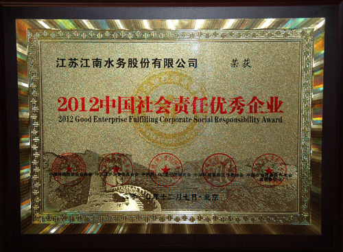 12月7日,2012中國企業社會責任年會在北京召開,在會上發布的“2012(第四屆)中國企業社會責任榜”中,公司憑借在履行社會責任方面的優秀表現,獲得了“社會責任優秀企業”的榮譽稱號。責任指數評估得分為78.66分,在上榜的80個企業中排名第41,是唯一獲得此獎項的水務企業。