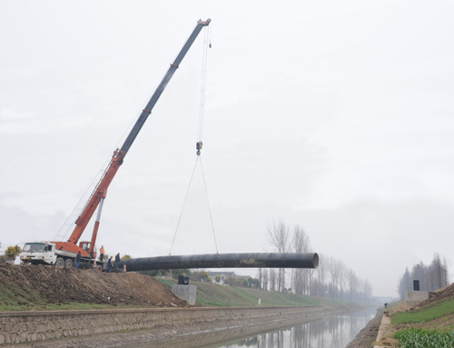 窯港河DN1400過河管是整個管道施工中的重點(diǎn)和難點(diǎn),管道跨度近30米,鋼管整體重量達(dá)11噸,且安裝地點(diǎn)兩岸地質(zhì)松軟,給吊裝工作增加了難度。對此,市政公司不等不靠,積極作為,多次組織專業(yè)技術(shù)人員和業(yè)務(wù)能手深入現(xiàn)場,對周圍環(huán)境進(jìn)行勘察,研究并制定了一套詳細(xì)的吊裝專業(yè)操作方案,為安全保質(zhì)完成吊裝任務(wù)提供了可靠保證。施工當(dāng)天,在場工作人員各司其職,配合默契,隨著現(xiàn)場總指揮的一聲令下,大型吊車緩緩伸出巨大的手臂,通過精準(zhǔn)指揮、精細(xì)操作,最終管道一次性準(zhǔn)確地吊至預(yù)定位置。