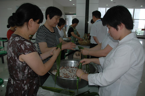 包粽子可是門技術(shù)活,別看他人三下兩下就包好一個,沒什么難度,真到自己動手才發(fā)現(xiàn),單單把米包進(jìn)粽葉不散就不容易,更別說包得有棱有角了。為了讓大家快速學(xué)會包粽子,公司請來幾位老阿姨言傳身教,你看,女員工圍在桌邊,仔細(xì)地向老阿姨學(xué)習(xí)討教呢。