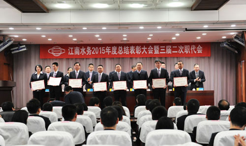 19日,公司在14樓會議室召開2015年度總結表彰大會暨三屆二次職代會。公司黨委書記、董事長龔國賢作講話,總經理沙建新作題為《新起點 新征程 創新實干實現水務事業新跨越》的2015年度總結報告,并詳細部署2016年度工作,明確各項目標任務。會議由副總經理高立主持。