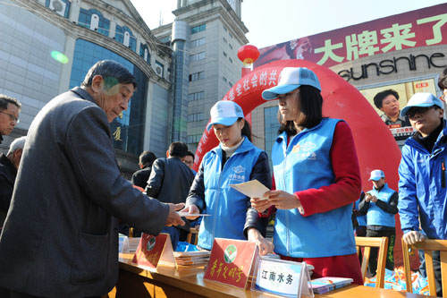 3月15日,在學(xué)院廣場(chǎng)。公司客服中心、澄中供水公司工作人員正熱情地向來往市民解答涉水疑問,解讀服務(wù)承諾,宣傳節(jié)約用水理念。